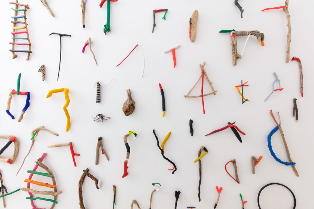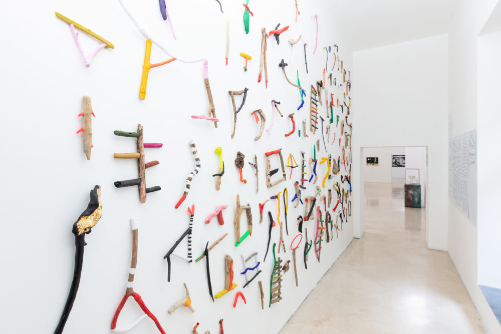 Alfabeto arcaico, l’opera entrata a far parte della collezione del Madre nell’ambito del progetto Per_formare una collezione. Per un archivio dell’arte in Campania e precedentemente esposta al PAN, al MANN e alla Certosa di San Giacomo a Capri, è un’installazione ambientale che si adatta al luogo che la ospita: intento dell’artista è infatti alterare l’equilibrio di uno spazio dato, reinventandolo creativamente e spiazzandone la percezione ordinaria. Composta da frammenti di legno dalla forma insolita recuperati sulla spiaggia, riassemblati e in alcuni casi dipinti dall’artista, l’opera è un alfabetiere immaginario dalla forte presenza visiva, che richiama arcaici sistemi di comunicazione, pur senza riferirsi a nessuno in particolare.