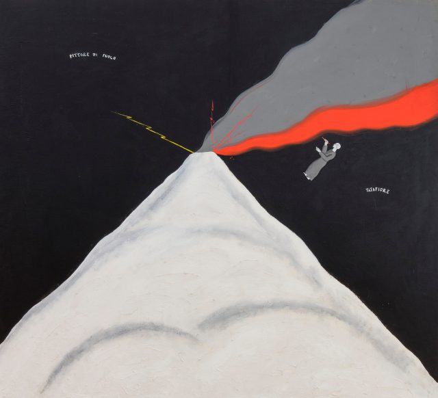 Legato alla galleria di Lucio Amelio, Tatafiore nel 1980 partecipa a Aperto ’80 nell’ambito della Biennale di Venezia e, elaborando un linguaggio pittorico in sintonia con la poetica della Transavanguardia, partecipa alle più importanti rassegne internazionali di quegli anni. Tra le costanti iconografiche rintracciabili nel lavoro di Tatafiore, anche la figura femminile assume un ruolo privilegiato, personificazione ora della Storia, ora della Virtù, ora della Religione. Dei primi anni Ottanta sono le prime opere sulla Rivoluzione francese e i suoi miti: Robespierre, Marat, la Dea Ragione, la Ghigliottina, Maria Antonietta. Robespierre, personaggio a cui è intitolata la scultura in collezione, è scelto quale emblema dell’eterno conflitto e dell’esasperazione della virtù, soggetto in grado fare risaltare con evidenza le contraddizioni tra ideali politici ed emozioni umane. Motti, giochi di parole, scritte, frasi e paradossi, appaiono nei dipinti, chiosando l’esistenza di forme che, negli anni, si arricchiscono di riferimenti iconografici. Numerosi sono anche i riferimenti tratti dalla cultura partenopea – Masaniello, Maradona, le Sirene, il Vesuvio, iconografia del dipinto in collezione Pittore di fuoco (1985).